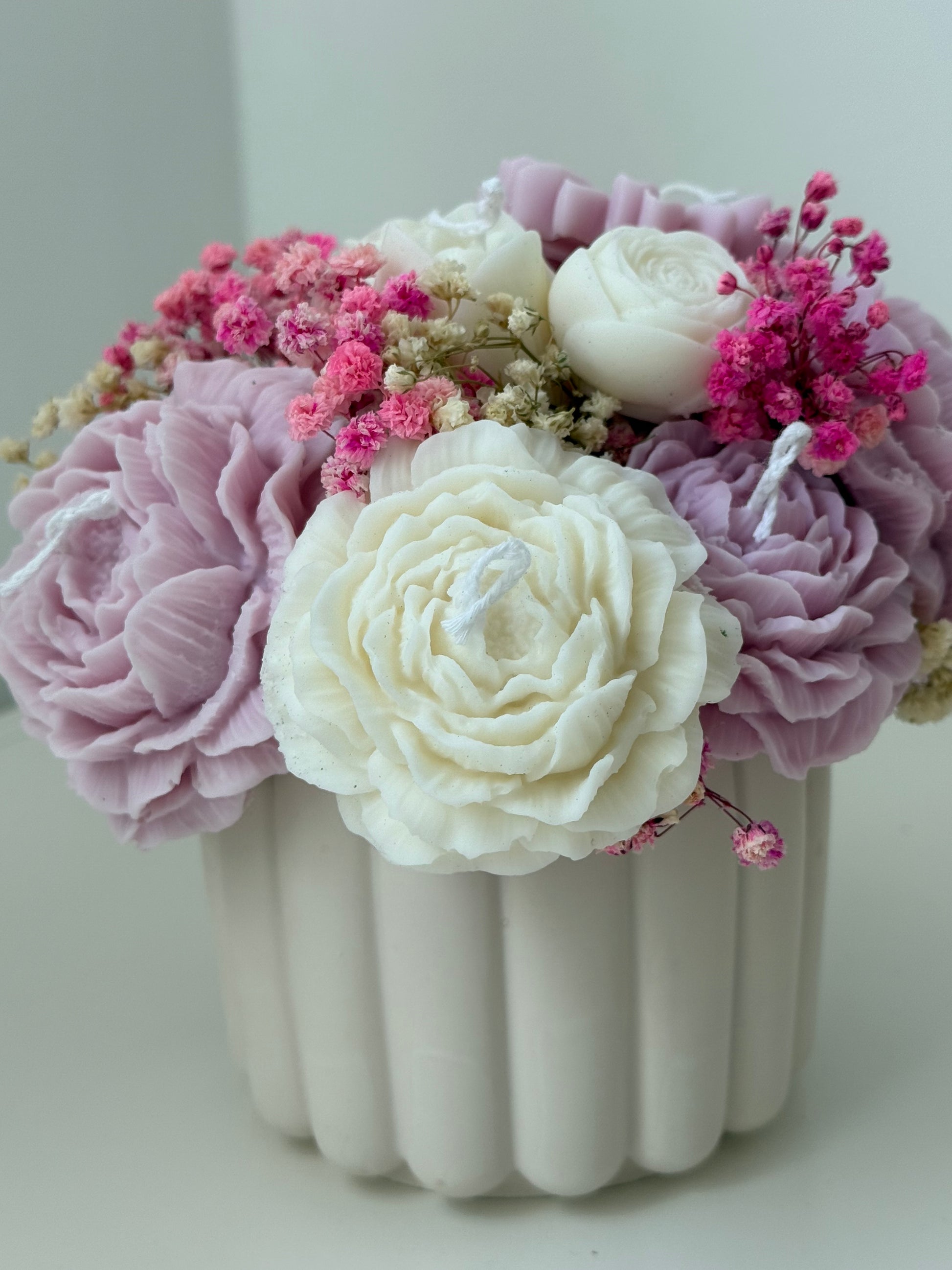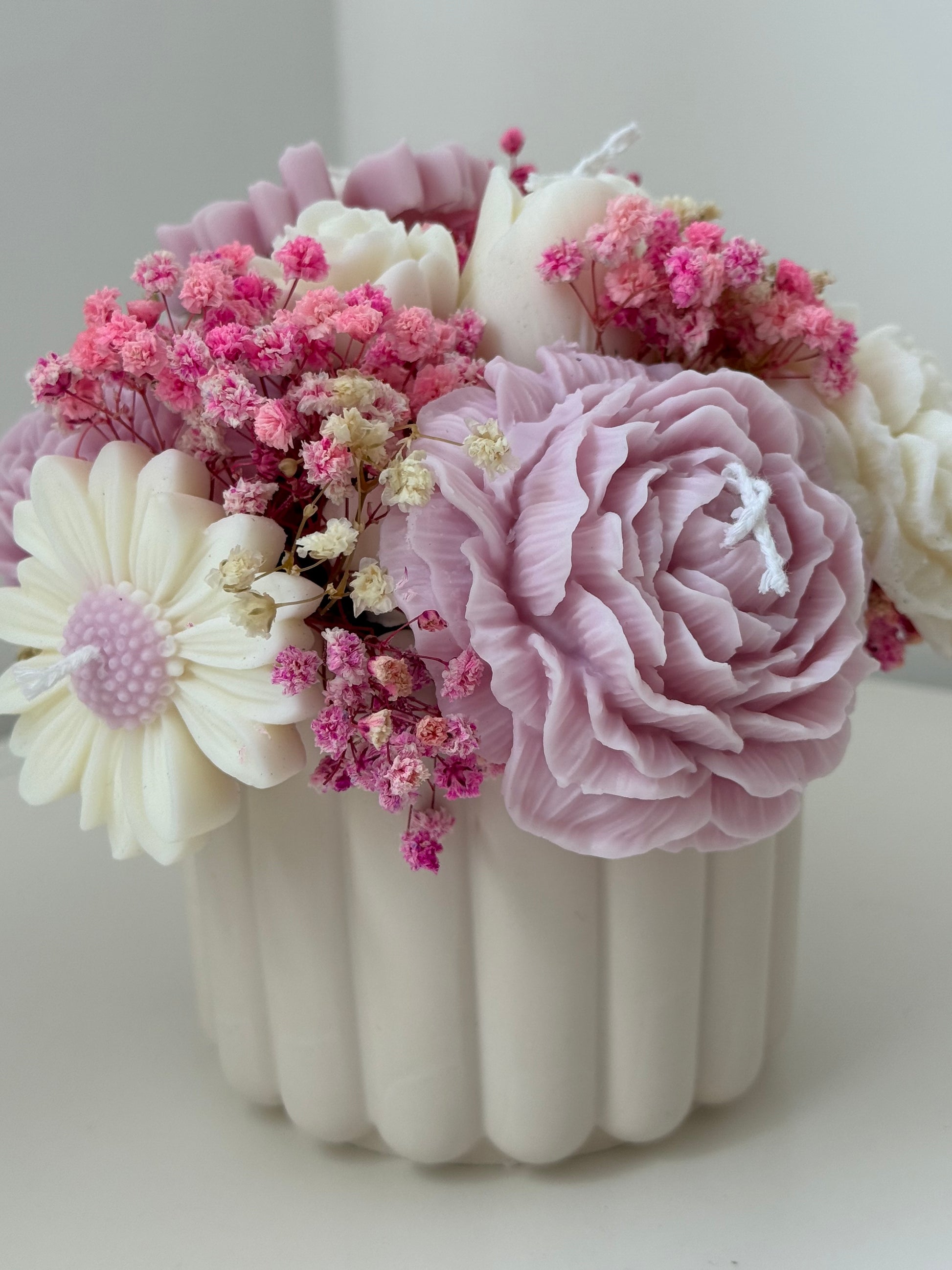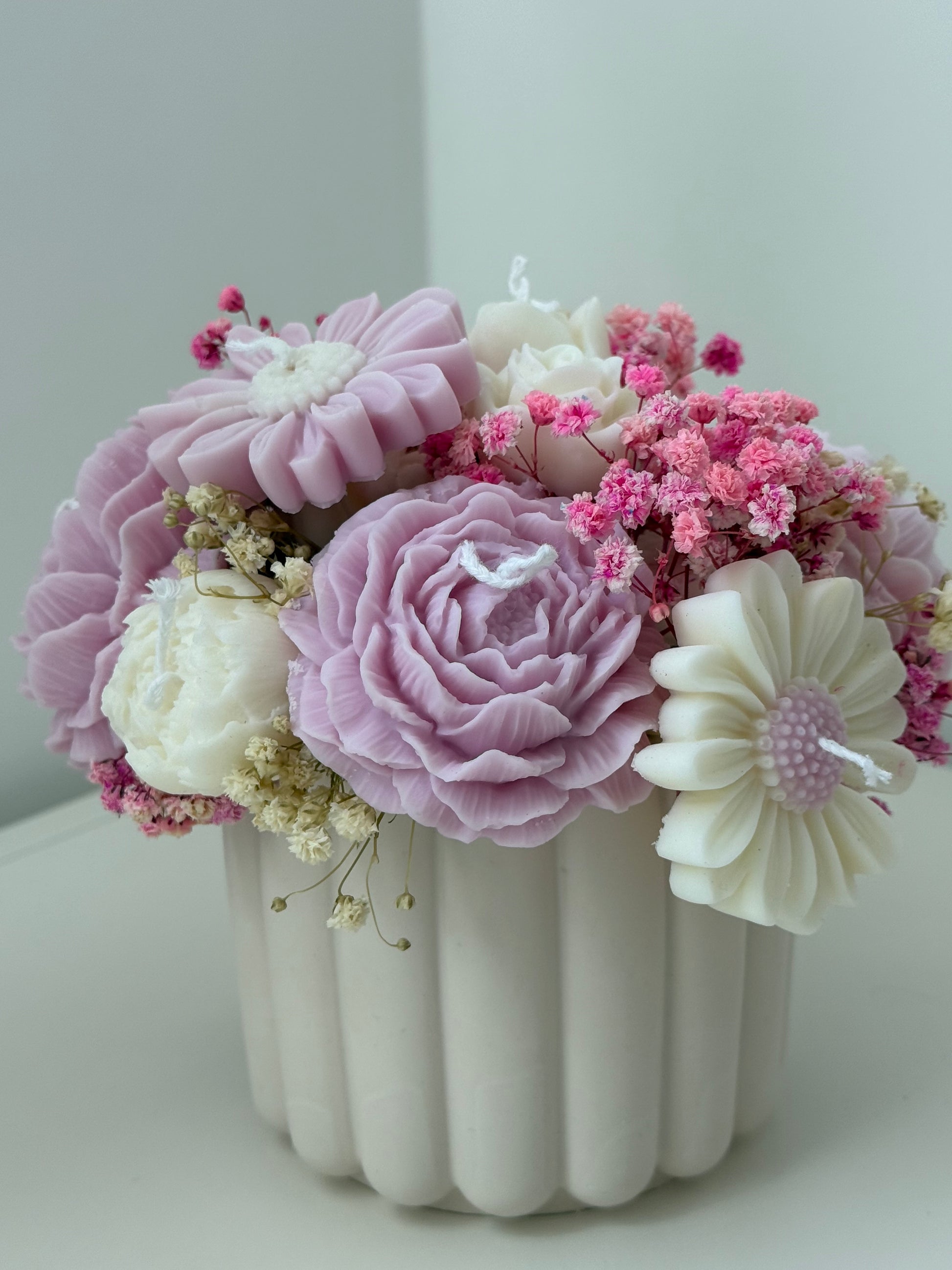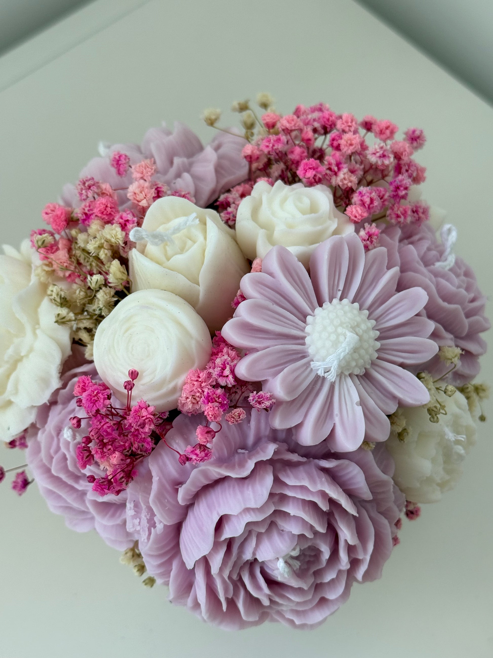 Delicado ramo que combina velas en forma de flores con toques de flor preservada, presentado en un elegante vaso de resina ecológica. Hecho a mano con cera de soja natural, es el detalle perfecto para regalar o decorar con estilo cualquier rincón.