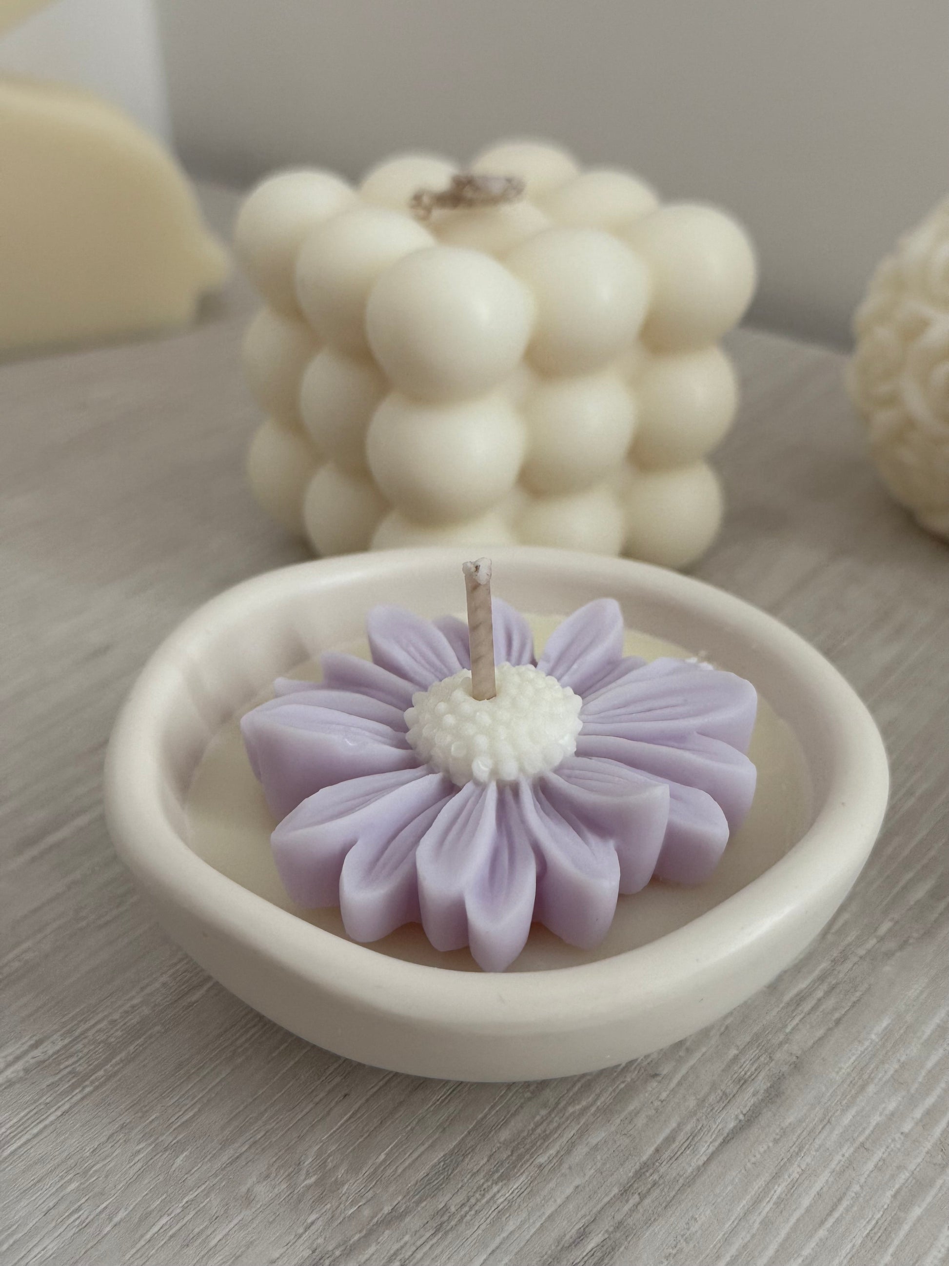 Vela artesanal con una flor margarita en base de resina ecológica Jesmonite. Ideal como regalo para recién nacidos, baby showers, bautizos, comuniones, bodas, eventos corporativos o simplemente como decoración para tu hogar. Hecha a mano con cera de soja 100% natural. Una pieza única que aporta ternura y estilo a cualquier espacio. ¡Personalizable y lista para regalar!