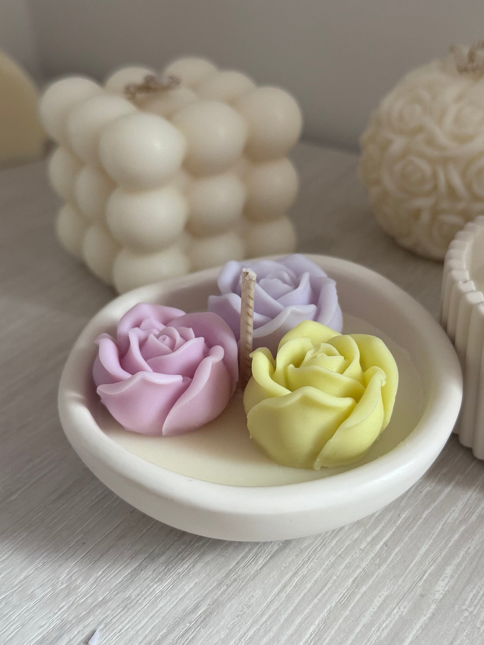 Vela artesanal con una tres flores variadas en base de resina ecológica Jesmonite. Ideal como regalo para recién nacidos, baby showers, bautizos, comuniones, bodas, eventos corporativos o simplemente como decoración para tu hogar. Hecha a mano con cera de soja 100% natural. Una pieza única que aporta ternura y estilo a cualquier espacio. ¡Personalizable y lista para regalar!