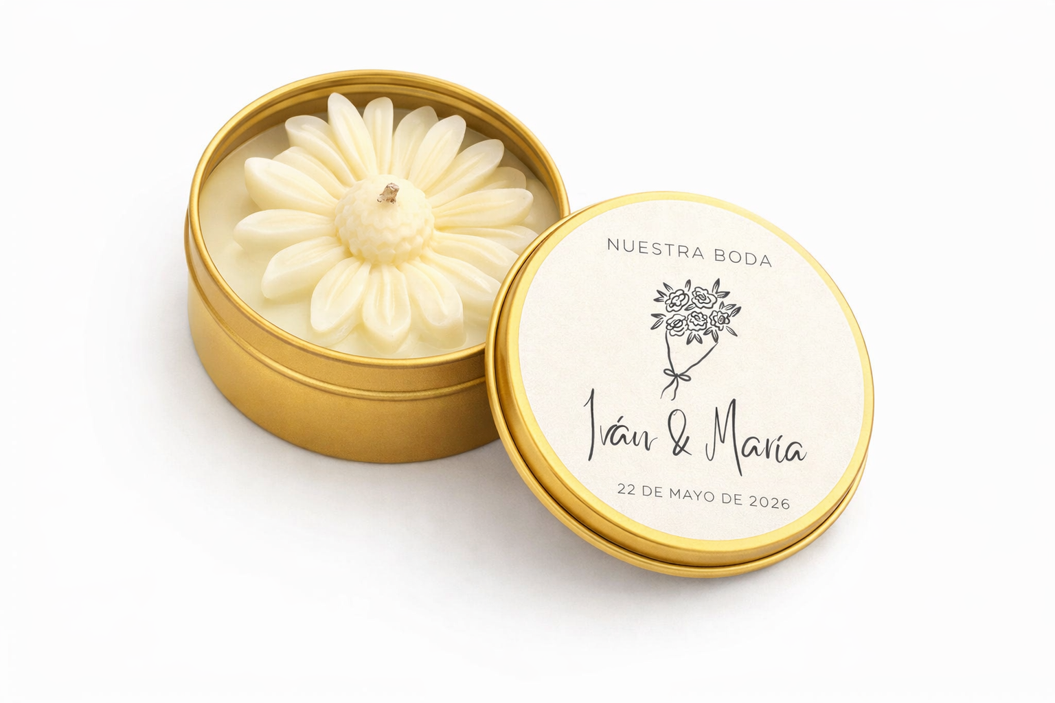Está elaborada a mano con cera de soja 100% natural, lo que garantiza una combustión limpia, duradera y libre de toxinas. Se presenta en una lata metálica dorada con tapa personalizada con nombres y fecha del evento, lista para regalar.