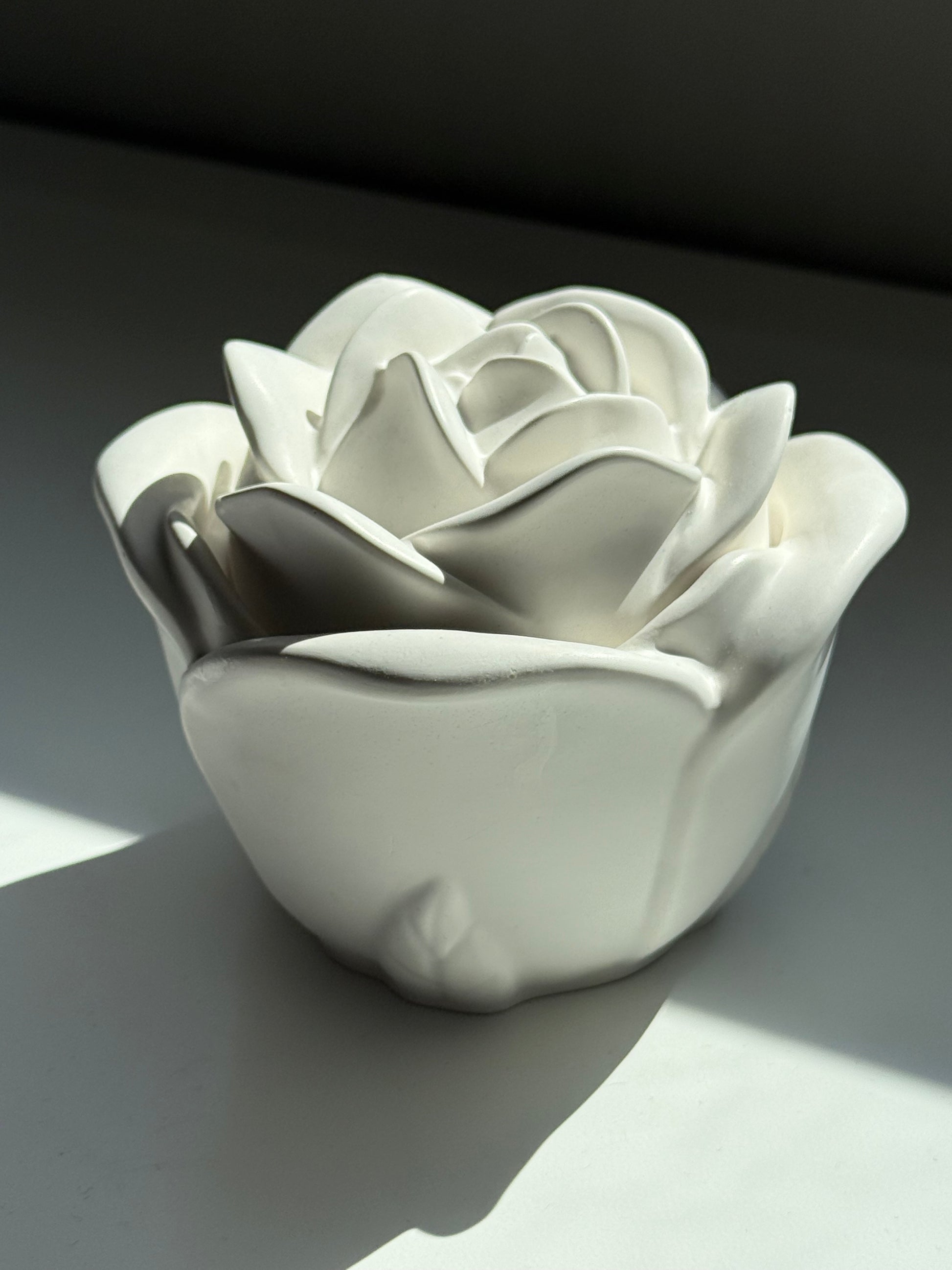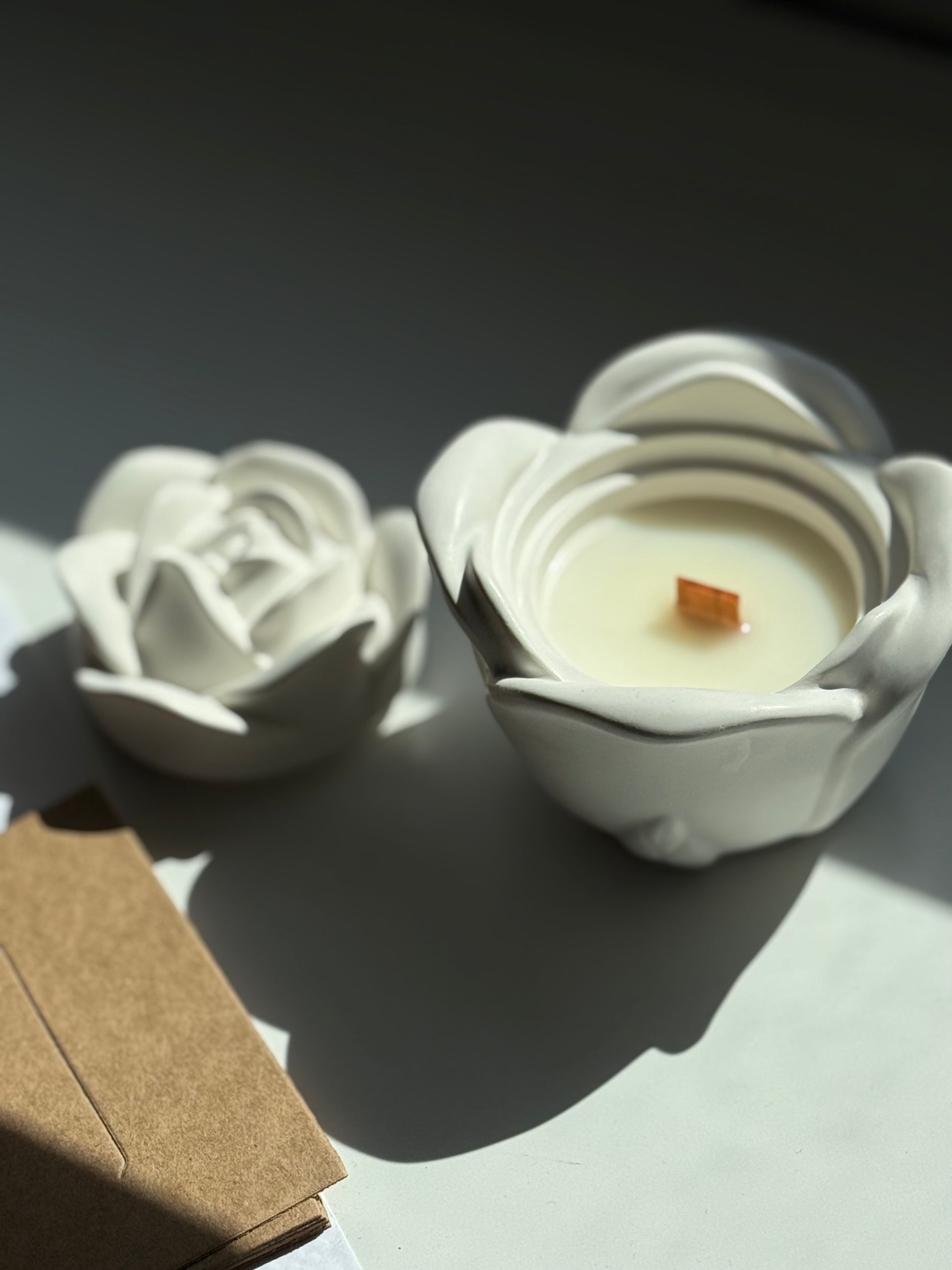 La Vela Rosa está elaborada artesanalmente con cera de soja natural y presentada en un delicado recipiente en forma de rosa, diseñado para convertirse en un bonito objeto decorativo cuando la vela se termina.